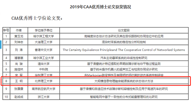 近日,北理工威尼斯登录入口welcome陈杰教授指导的博士生王钢的博士学位论文《大规模信息物理融合能源系统的状态估计方法》获得CAA2019年优秀博士学位论文奖。