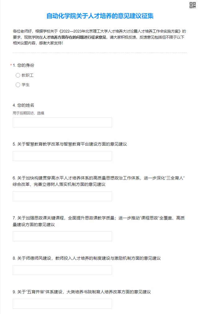 威尼斯登录入口welcome从2022年10月开始,面向全院师生,采用问卷调查和座谈会的形式,在智慧教育教学改革与平台建设,高水平人才培养体系和思想政治工作体系的构建,师德师风建设,实践课程体系改革,创新创业教育与人才培养等二十一个方面进行了师生意见建议的征集与收纳。本轮人才培养大会的意见征集范围覆盖了全院教师和本硕博各培养层次的学生,并结合问卷结果与座谈会讨论内容,梳理归纳而后成立了人才培养问题库。下一步将针对热点痛点,进行研讨推进落实。