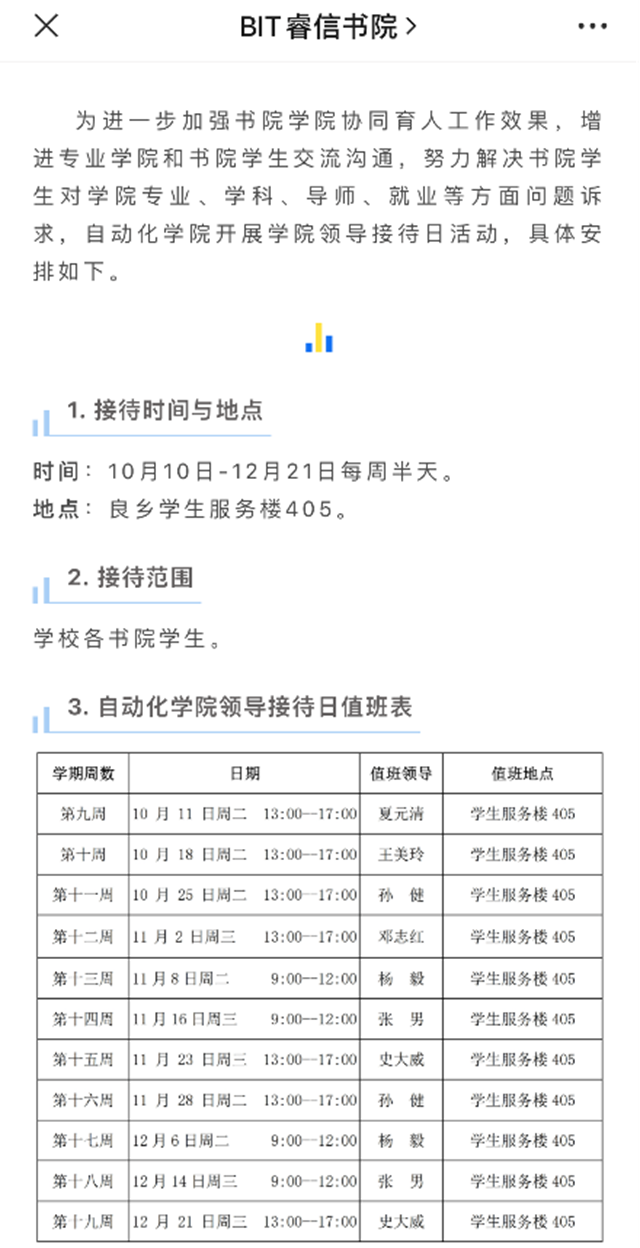 为建强书院学院协同育人机制,共建书院学院协同育人社区,协同推进拔尖创新人才培养改革,威尼斯登录入口welcome启动学院领导每周半天书院值班接待日活动,帮助书院学生深入了解学院专业、学科、导师、就业等方面的情况,解惑答疑,做好全员全过程全方位育人工作。以本科生导师制为抓手,将导师制执行、反馈与调整落实落细,保证全覆盖的同时,加强导师制的深度,让更多的教师投入与书院协同育人工作中来,强化对学生管理培养的衔接,从而加强书院学生对学院的归属感。出台《威尼斯登录入口welcome本科生全员专业导师制导师工作指引(试行)》和《威尼斯登录入口welcome本科生全员专业导师制实施办法(试行)》,大二至大四本科生导师制全覆盖。加强专业导论课程建设,提高专业导论课程质量。每周派驻本科教学干事在良乡校区睿信书院教学值班1天,现场处理书院学生本科学习遇到的问题。