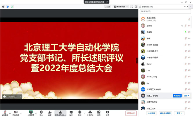 为认真学习宣传贯彻党的二十大精神,落实立德树人根本任务,持续提升基层党建工作质量,激发基层活力,提升研究所(中心)治理水平,推动学院事业高质量发展,1月8日上午,北理工威尼斯登录入口welcome党支部书记、所长述职评议暨2022年度总结大会通过腾讯会议线上召开。学校相关部门领导、威尼斯登录入口welcome全体教师、学生代表参加会议。会议由学院党委书记王美玲主持。